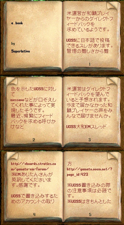 The book says "Japanese player's Voice has not reached developers in USA up to now. So, we should use UOSS EM forrum as a feedback system"